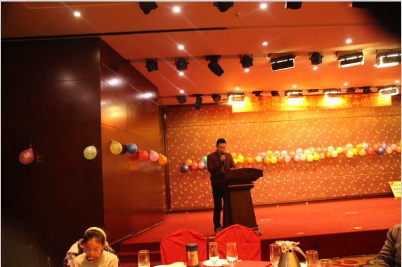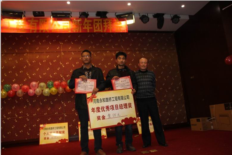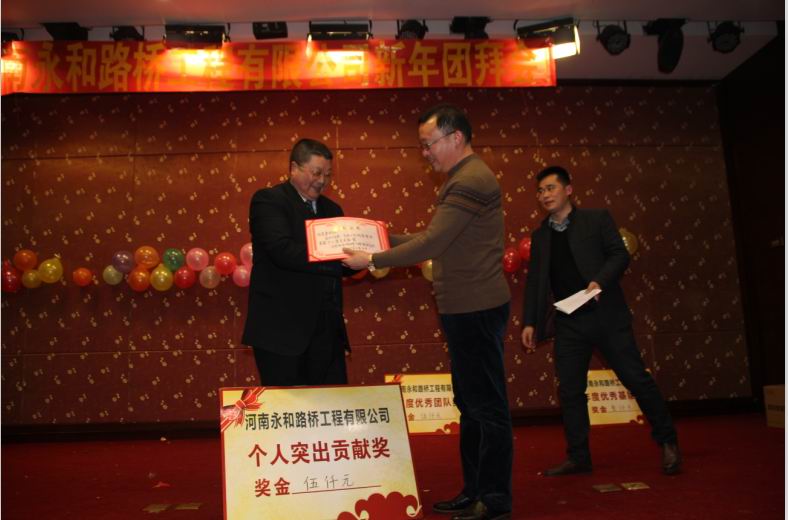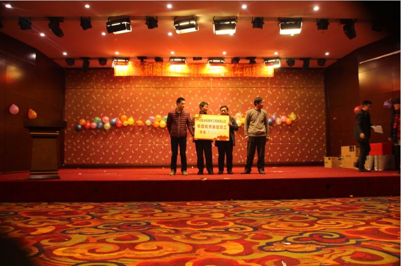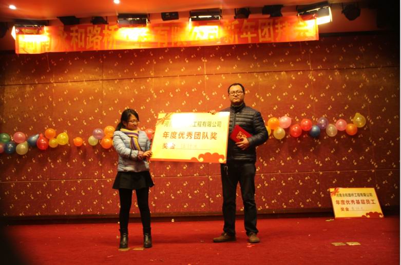 2016年2月4日晚,農(nóng)歷臘月26日晚,河南永和路橋工程有限公司在信陽(yáng)市五星 級(jí)酒店中樂(lè)百花酒店隆重的舉行了2016年新春團(tuán)拜會(huì),本次團(tuán)拜會(huì)由公司全體員工及家屬、公司的合作伙伴、朋友等共同出席,大家歡聚一堂、把酒言歡、其樂(lè)融融。公司董事長(zhǎng)孔總發(fā)表新年賀詞比代表公司對(duì)年度優(yōu) 秀個(gè)人及團(tuán)隊(duì)進(jìn)行了表彰。公司還為到場(chǎng)的每位小寶寶送上新年祝福和紅包,并準(zhǔn)備了抽獎(jiǎng)環(huán)節(jié)。大家歡歌笑語(yǔ),一直將熱鬧、愉快的氛圍維持到午夜。圖為團(tuán)拜會(huì)期間頒獎(jiǎng)儀式
