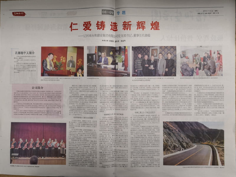 2018年11月7日,《信陽(yáng)晚報(bào)》刊發(fā)了對(duì)河南永和建設(shè)集團(tuán)有限公司黨支部書(shū)記、董事長(zhǎng)孔德穩(wěn)的相關(guān)專訪內(nèi)容,文章對(duì)于孔德穩(wěn)的創(chuàng)業(yè)之路、經(jīng)營(yíng)之道、踐行企業(yè)社會(huì)責(zé)任之舉以及弘揚(yáng)傳統(tǒng)文化之策進(jìn)行了深刻剖析。